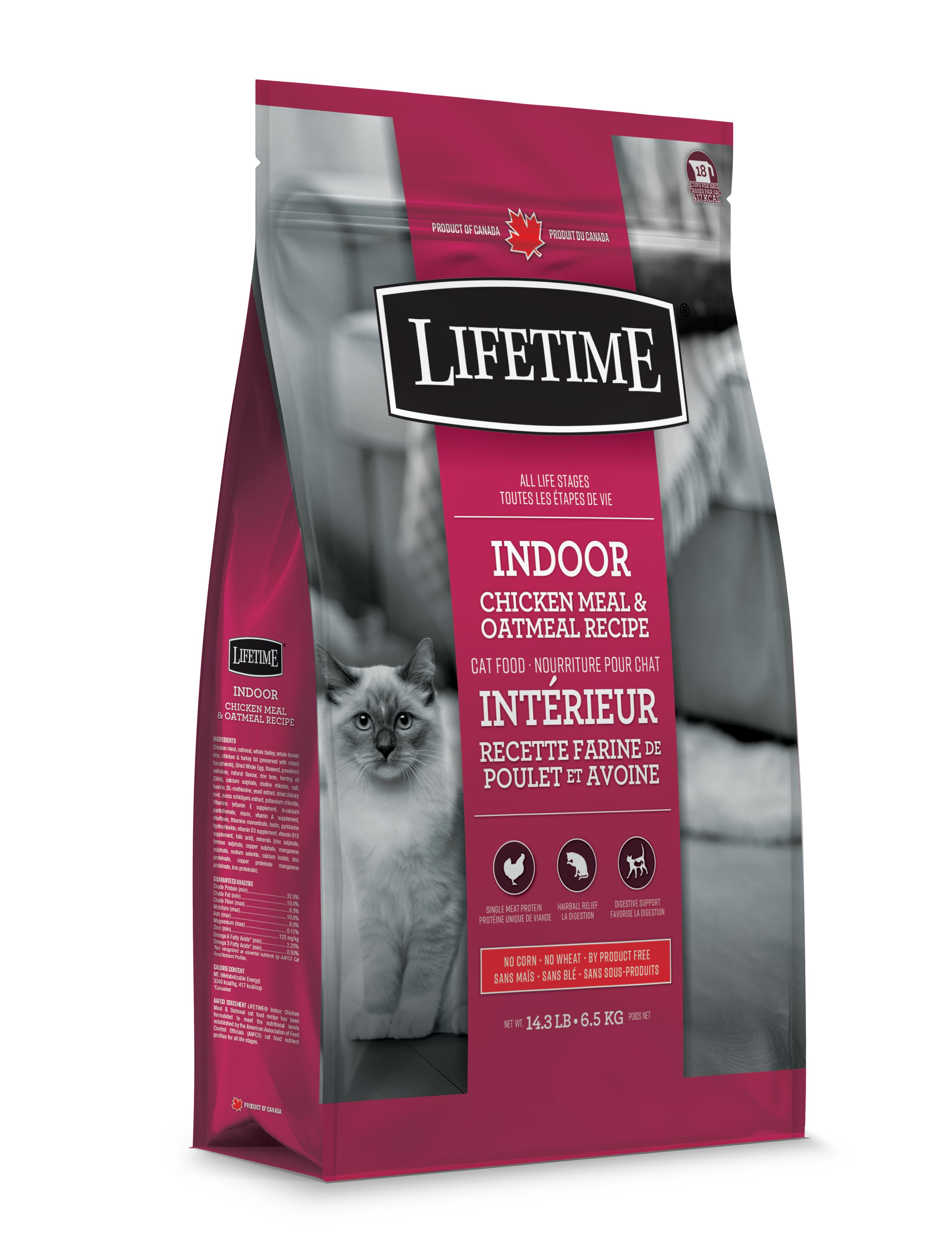 Lifetime Indoor Chicken Meal & Oatmeal Recipe Cat Food is formulated to meet the nutritional levels established by the AAFCO Cat Food Nutrient Profiles for all life stages.