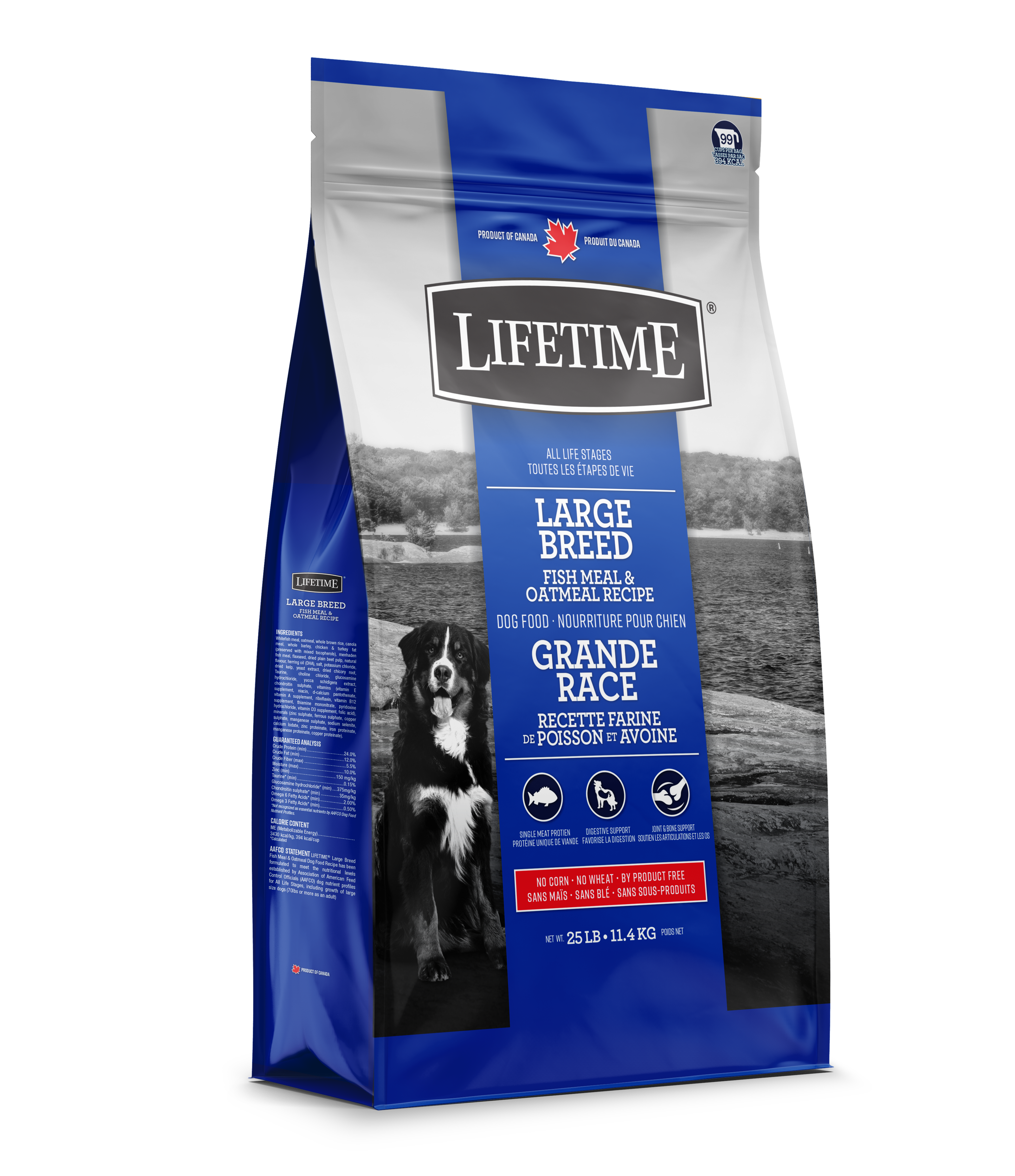 Lifetime Large Breed Fish Meal & Oatmeal Recipe Dog Food is formulated to meet the nutritional levels established by the AAFCO Dog Food Nutrient Profiles for all life stages including growth of large size dogs (70 lb or more as an adult).