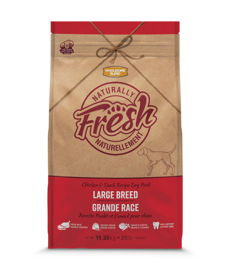 Wholesome Blend Naturally Fresh Chicken and Duck Recipe Dog Food is formulated to meet the nutritional levels established by the AAFCO Dog Food Nutrient Profiles for all life stages including growth of large size dogs (70 lb or more as an adult).
