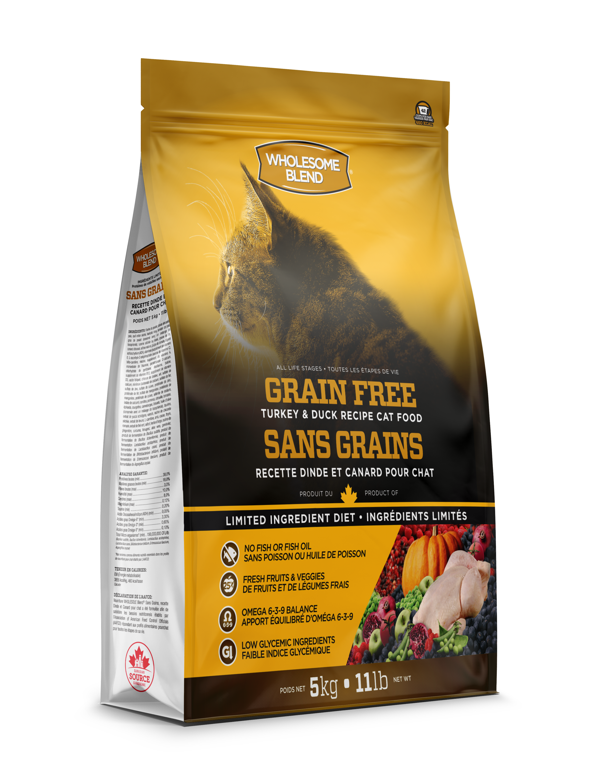 La recette Wholesome Blend Naturellement Fresh sans grains à la dinde et au canard pour les chats est formulée pour répondre aux besoins nutritionnels établis par le profil nutritionnel des aliments pour chats de l’AAFCO pour tous les stades de vie.